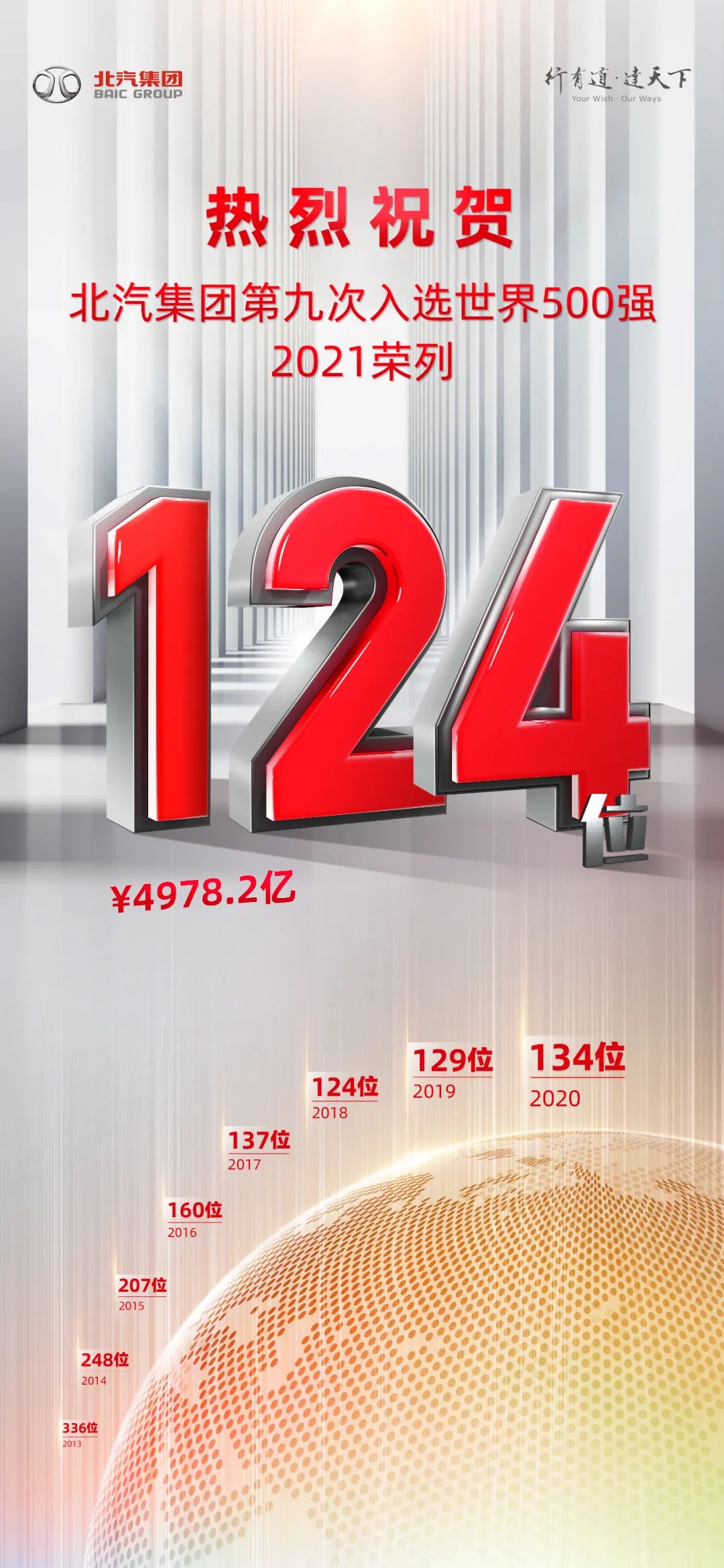 北京時間8月2日,2021《財富》世界500強排行榜正式公布,北京汽車集團有限公司營收以4978.2億元人民幣位列排行榜第124位,這是北京汽車集團有限公司2013年首次入榜后,連續九年穩居500強行列,八年間攀升了212位。