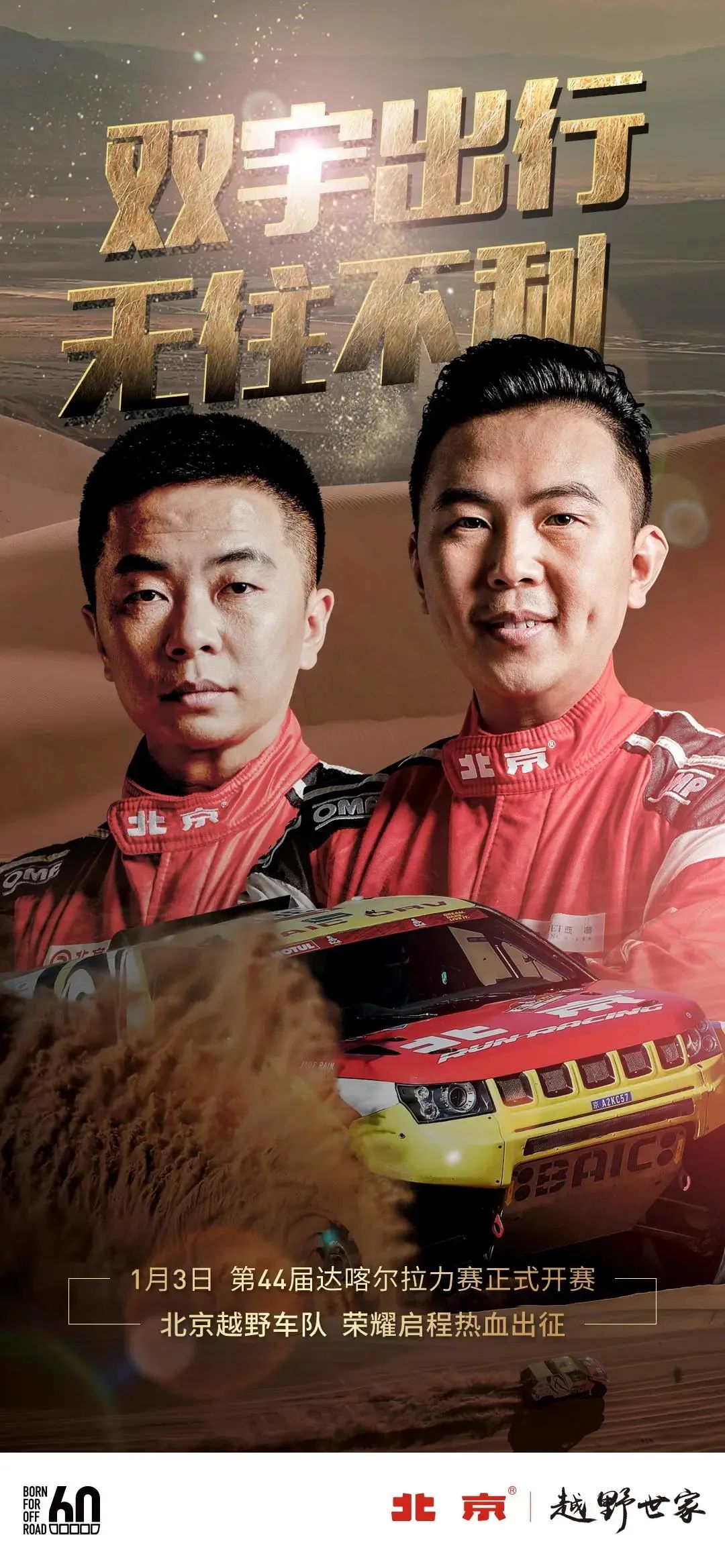 本屆賽事,北京越野車隊派出張國宇、潘宏宇兩員猛將參加。車手張國宇大賽經(jīng)驗豐富,曾斬獲諸多榮譽,領(lǐng)航員潘宏宇同樣擁有豐富的經(jīng)驗,此次二人攜手劍指大漠,“雙宇”合璧無往不利。另外,本次出戰(zhàn)的北京越野BJ40戰(zhàn)車,經(jīng)過特殊設(shè)計,整車重量分配更加平衡、動態(tài)操控更好響應、發(fā)動機更耐久耐高溫。無論是戰(zhàn)風沙、越山丘還是攀陡坡,BJ40動力十足,從容應對達喀爾拉力賽的兇險路況,全方位為車手安全護航。此次參賽,北京越野車隊無懼挑戰(zhàn),已做好馳騁賽場的準備。